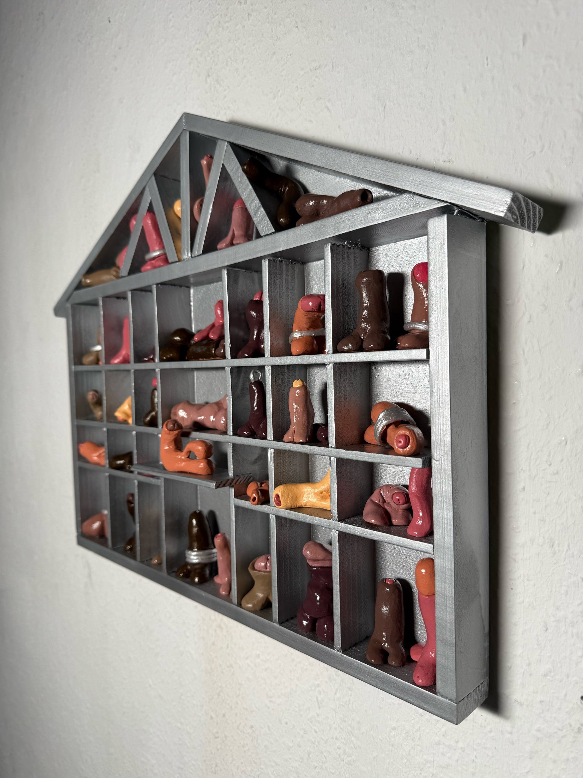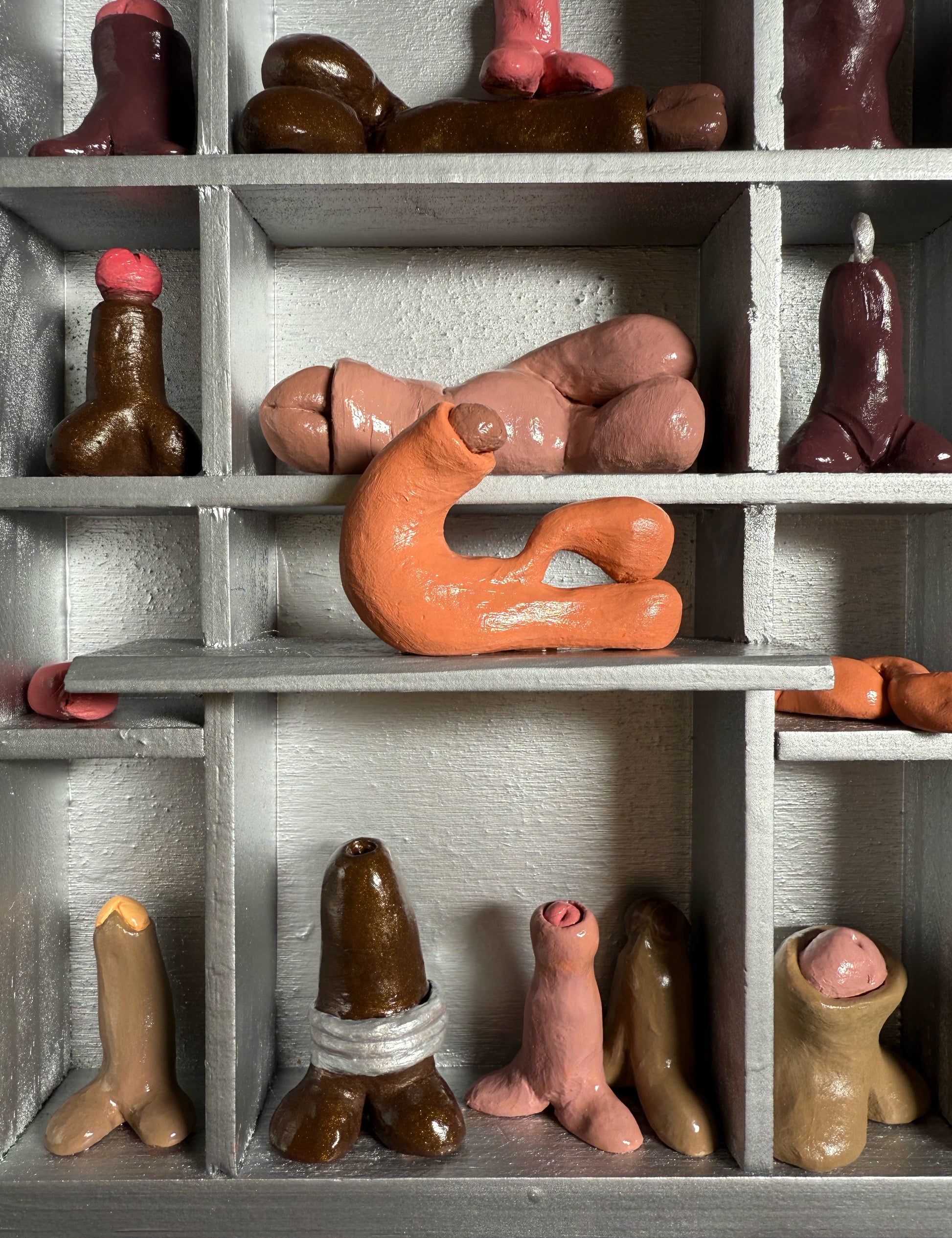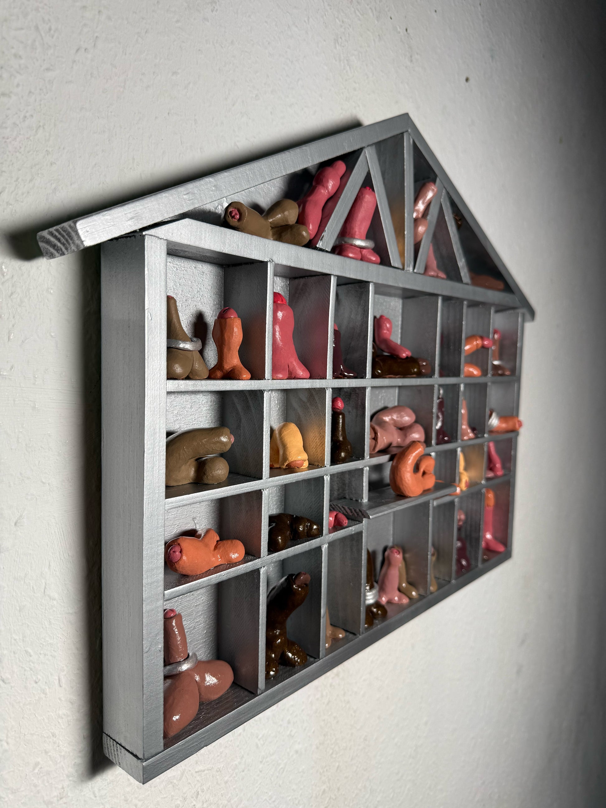 Sculpted clay penises of various sizes, shapes, and colors are arranged in a vintage wooden miniature showcase shelf, typically used for small collector’s items.