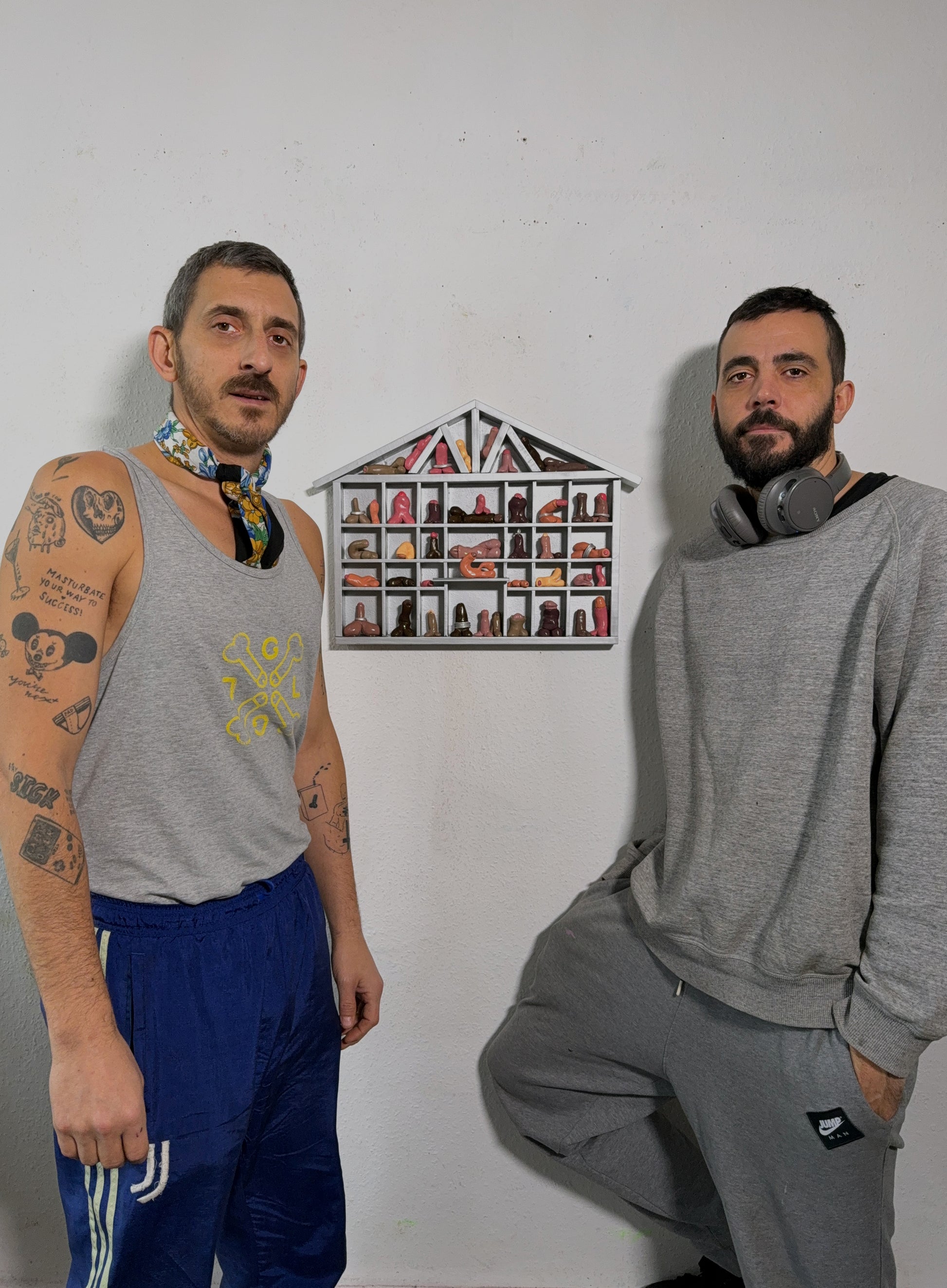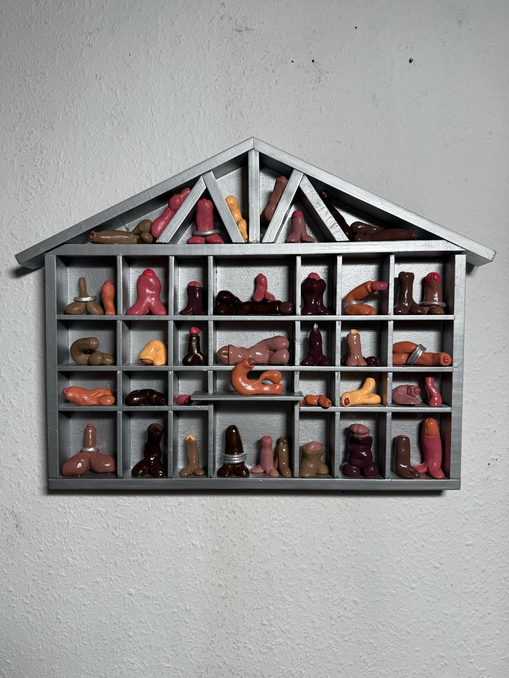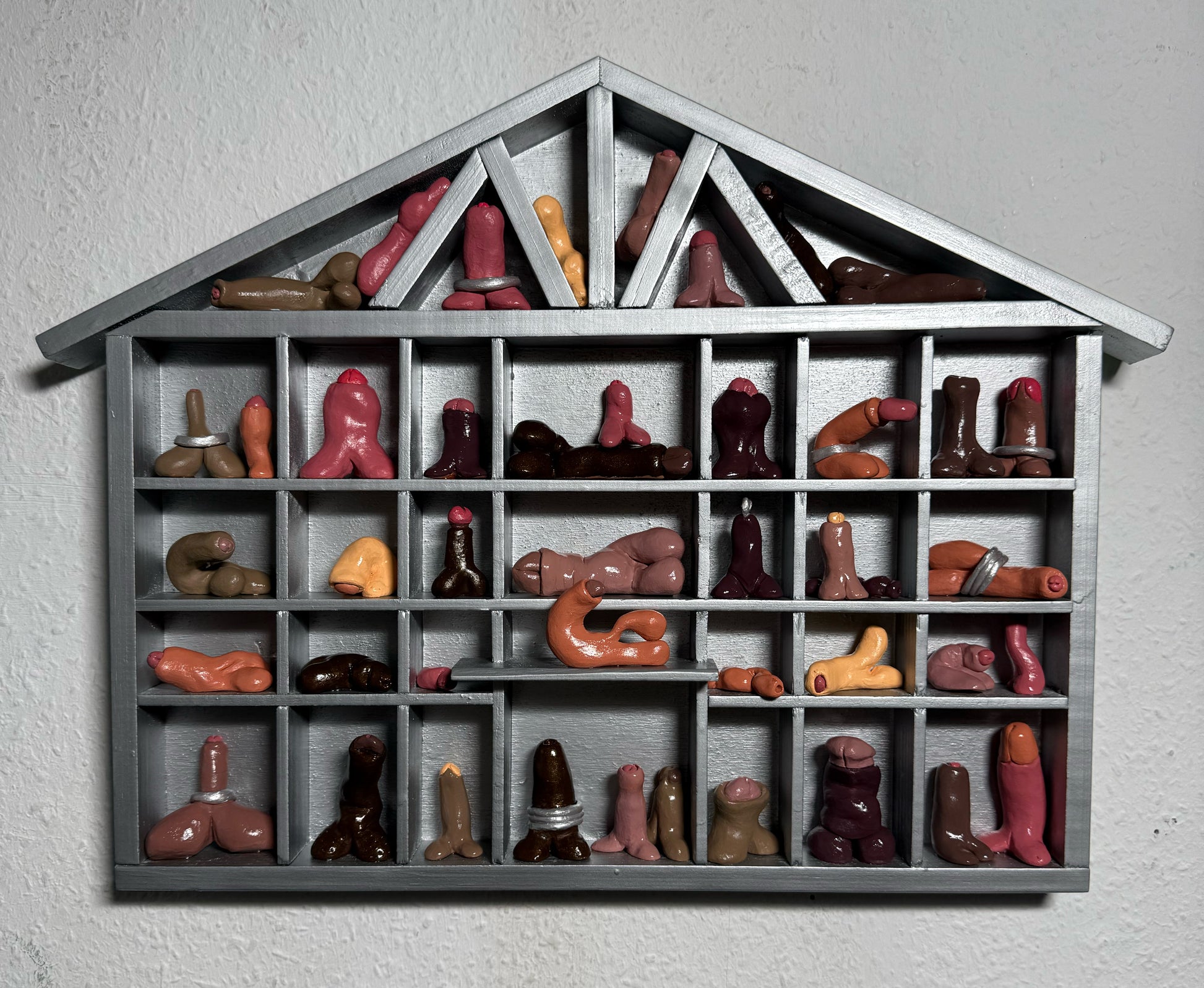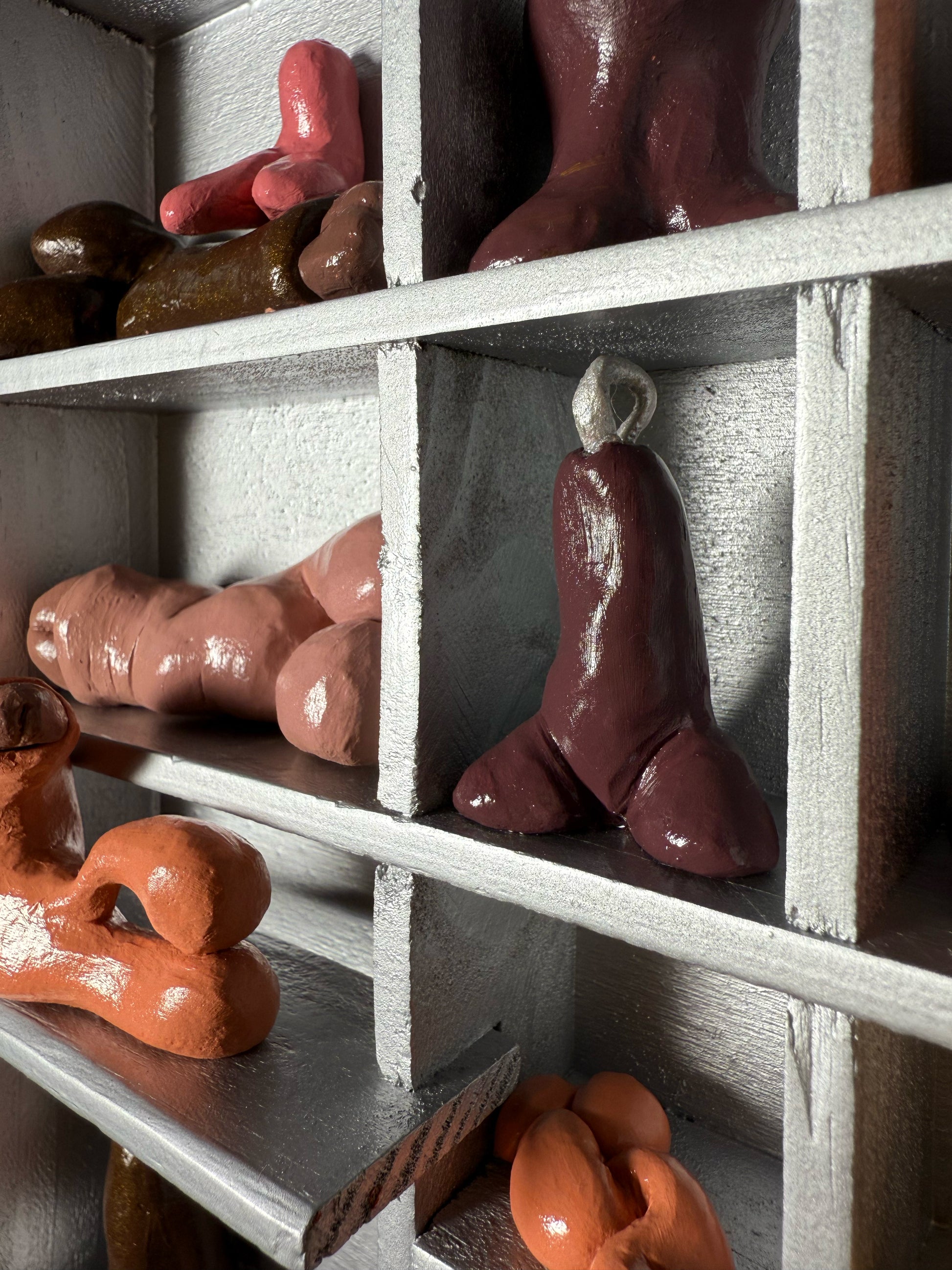 Sculpted clay penises of various sizes, shapes, and colors are arranged in a vintage wooden miniature showcase shelf, typically used for small collector’s items.