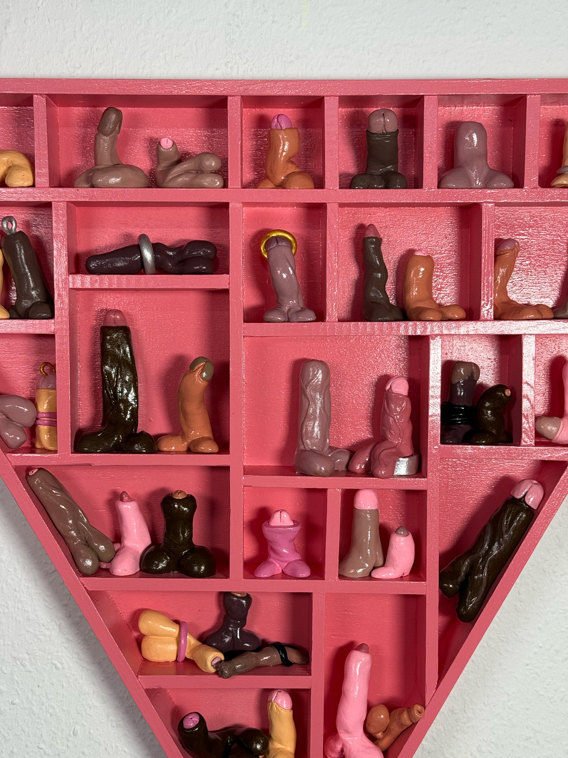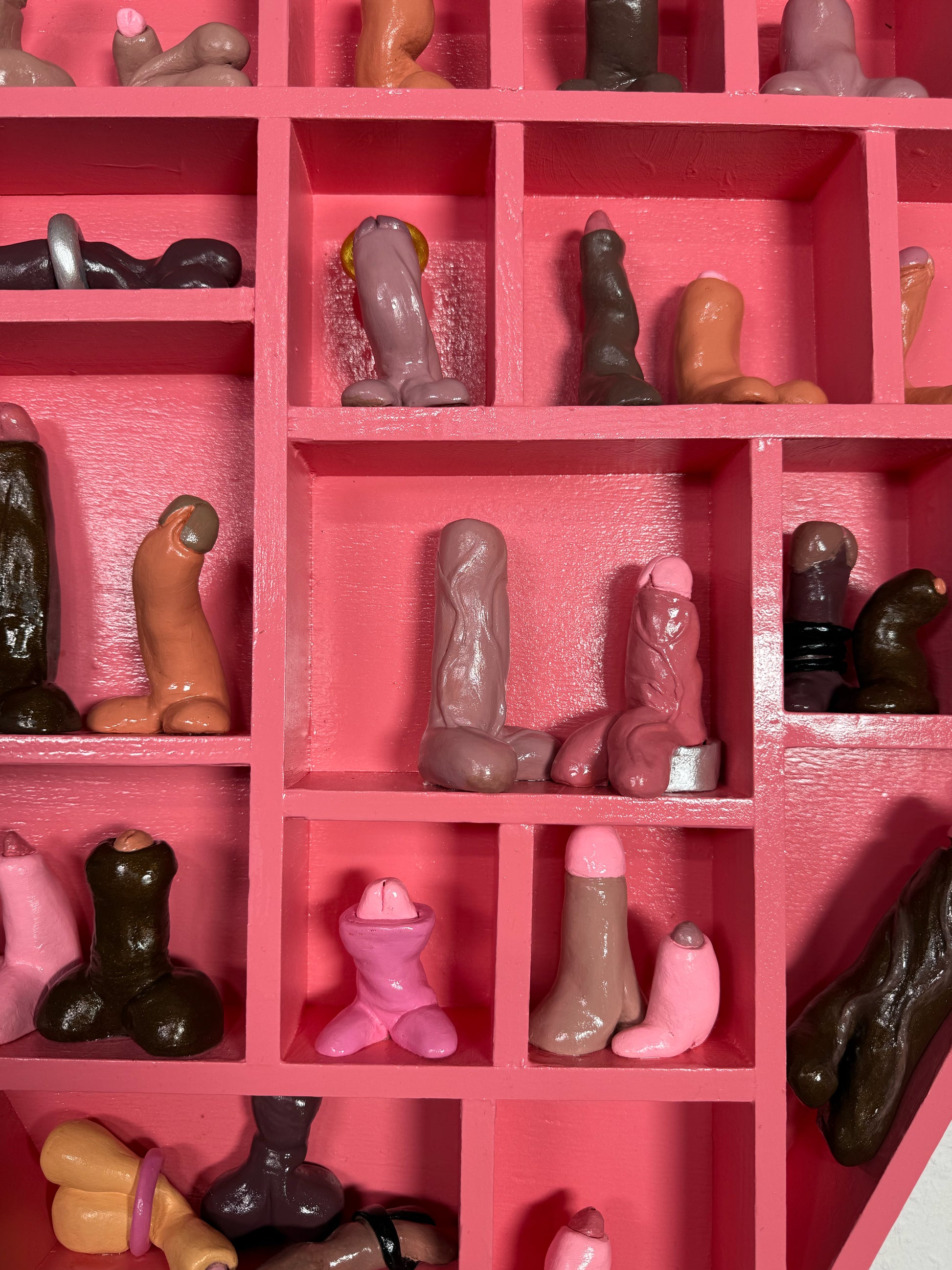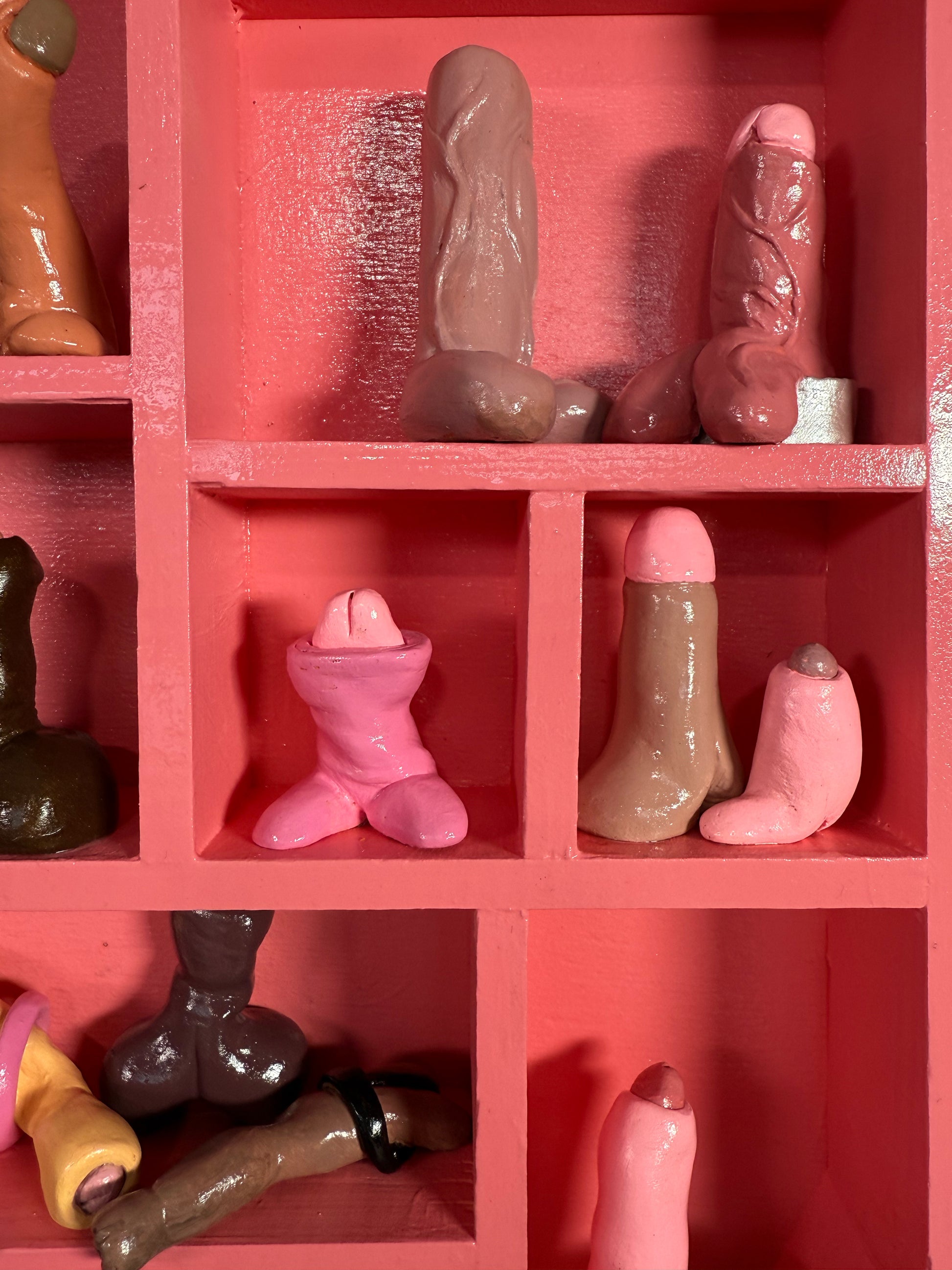 Sculpted clay penises of various sizes, shapes, and colors are arranged in a vintage wooden miniature showcase shelf, typically used for small collector’s items.