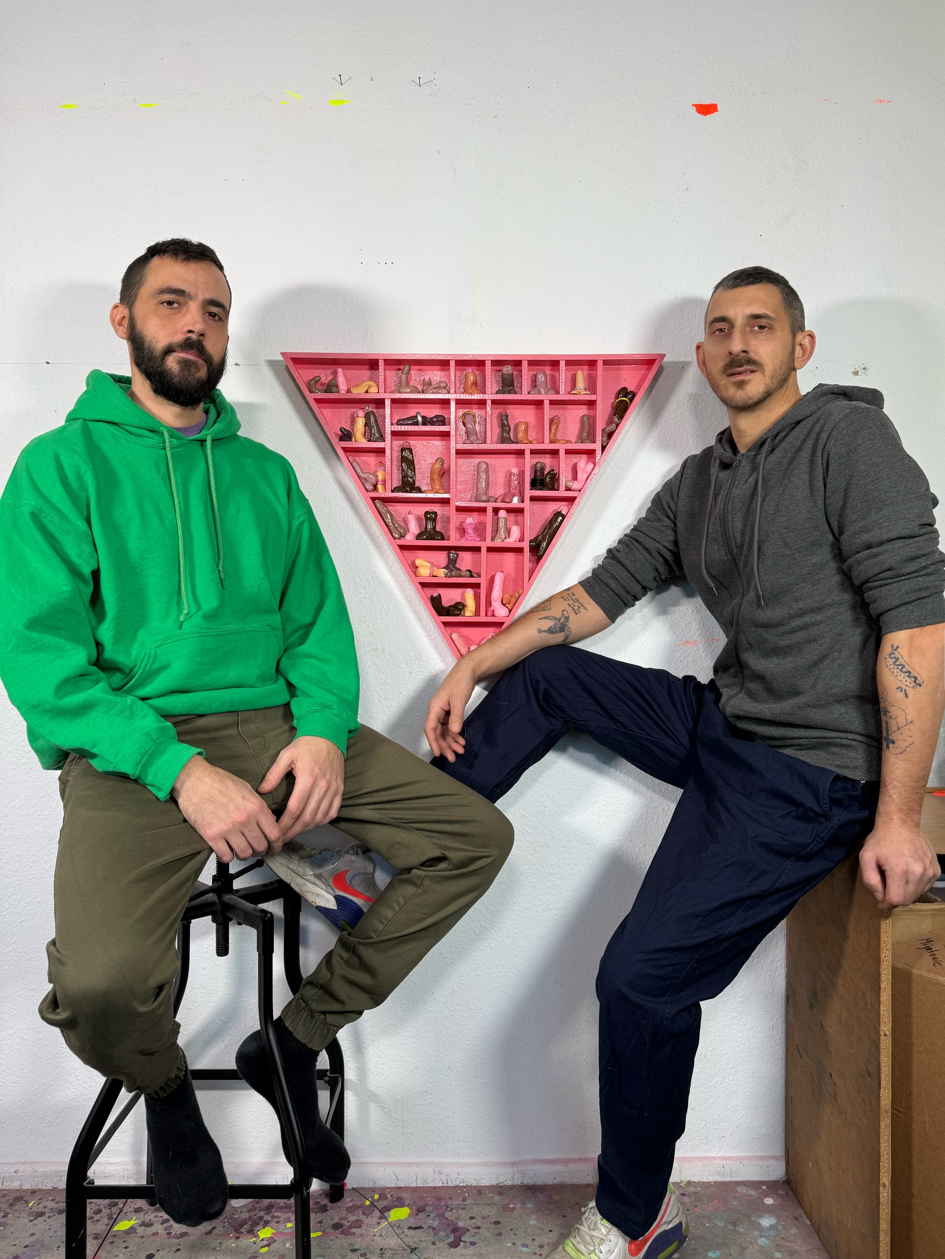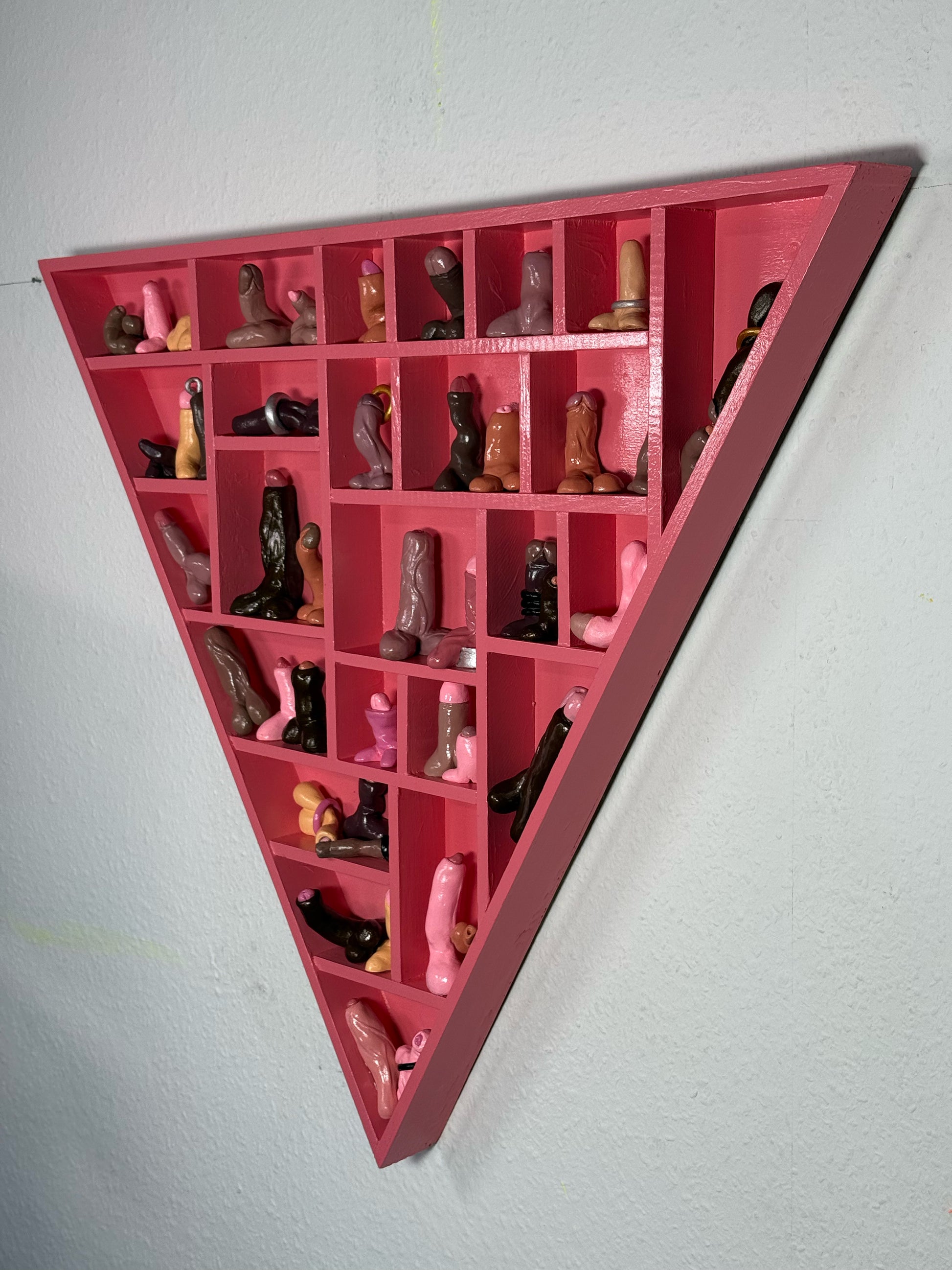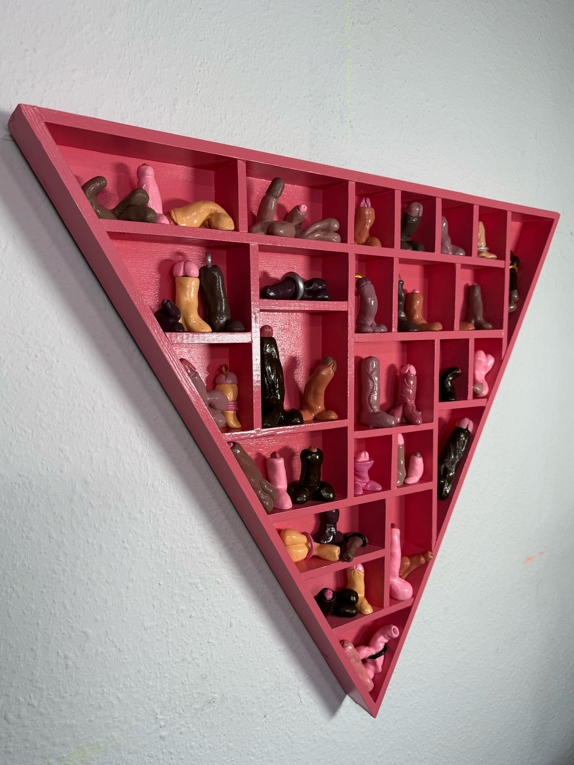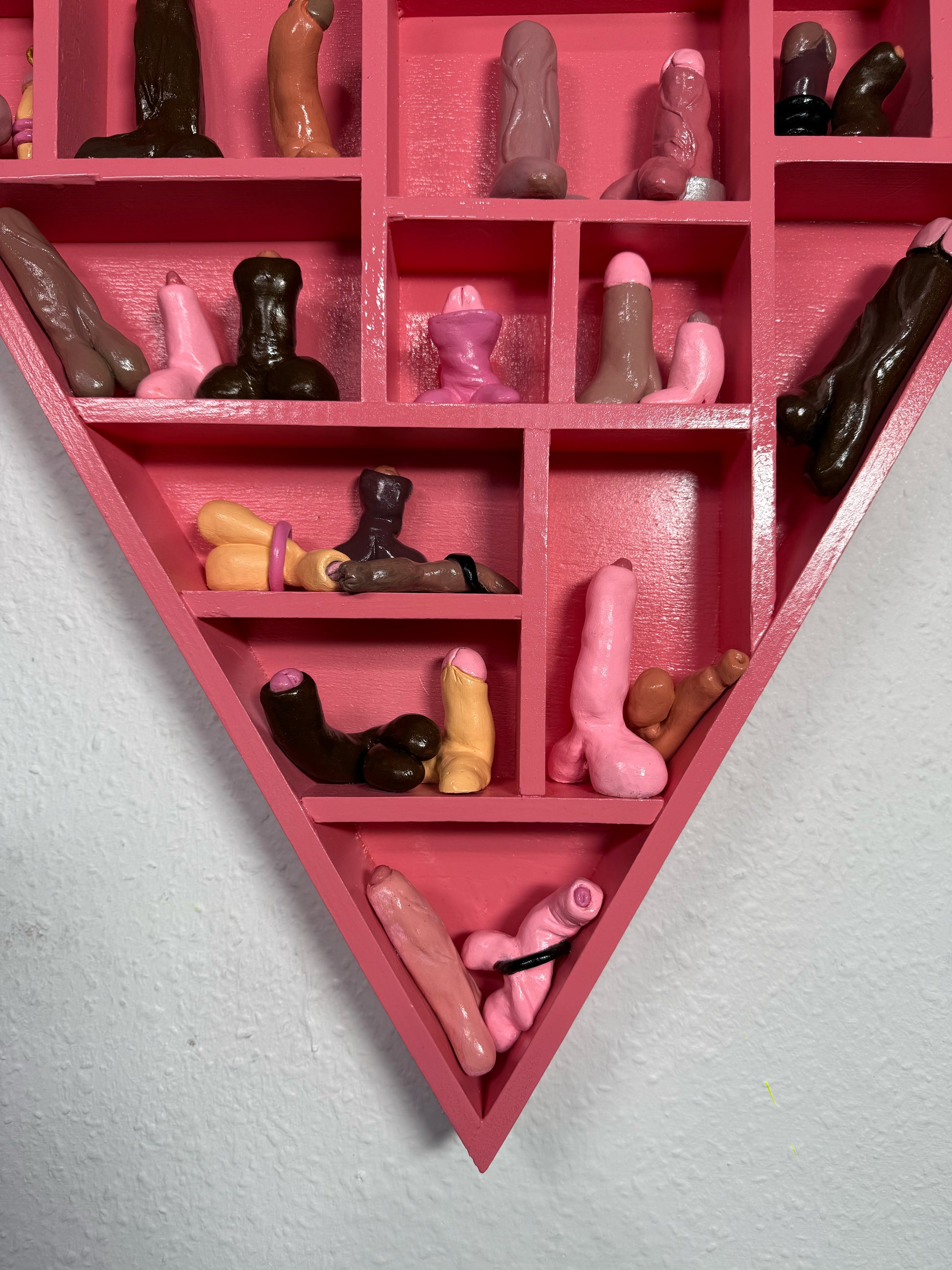 Sculpted clay penises of various sizes, shapes, and colors are arranged in a vintage wooden miniature showcase shelf, typically used for small collector’s items.