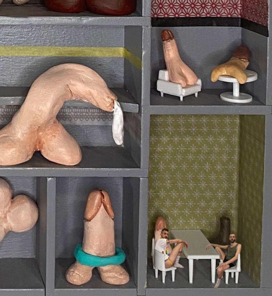 Sculpted clay penises in different sizes, shapes, and colors in a wooden miniature showcase shelf for small collectors‘ items. In ‚Dickversity,‘ we celebrate inclusion. This series is a humorous approach to the infamous ‚gay fixation‘ on penis sizes, as well as the exclusion of others based on certain physical criteria such as skin color or body image.