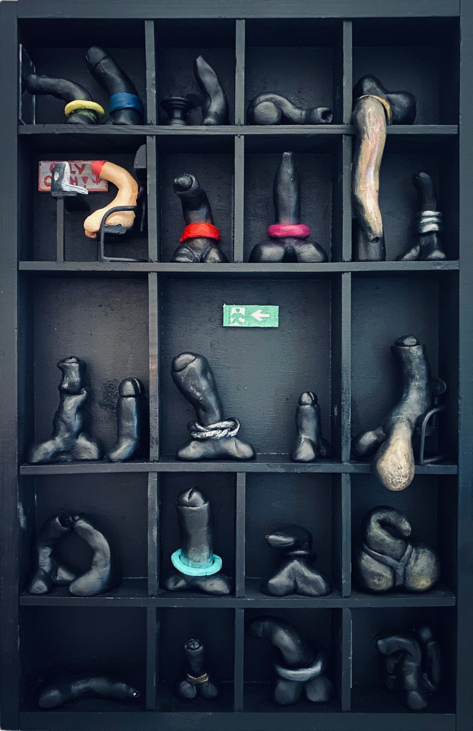 Sculpted clay penises in different sizes, shapes, and colors. Wooden miniature showcase shelf for small collector's items.