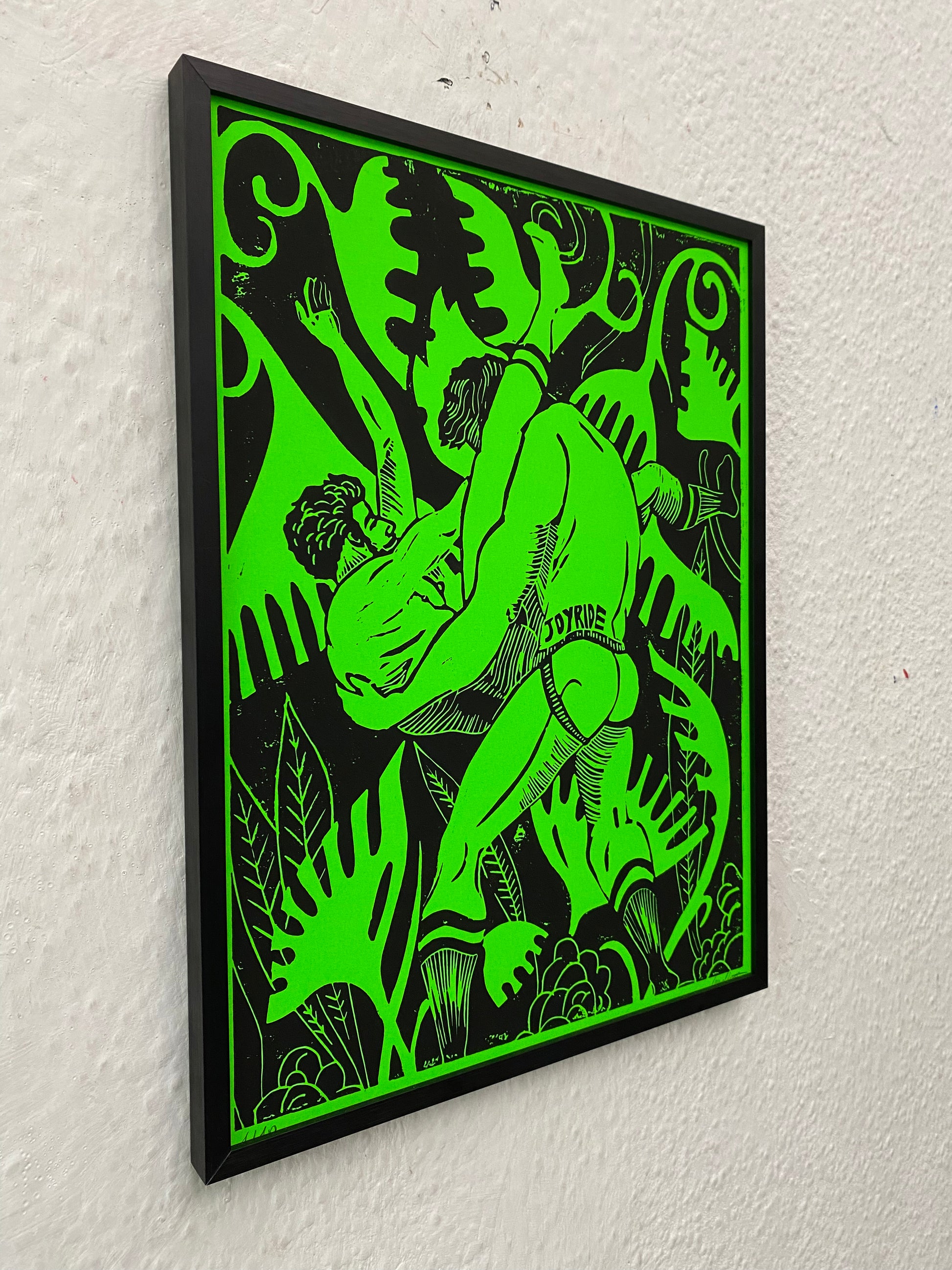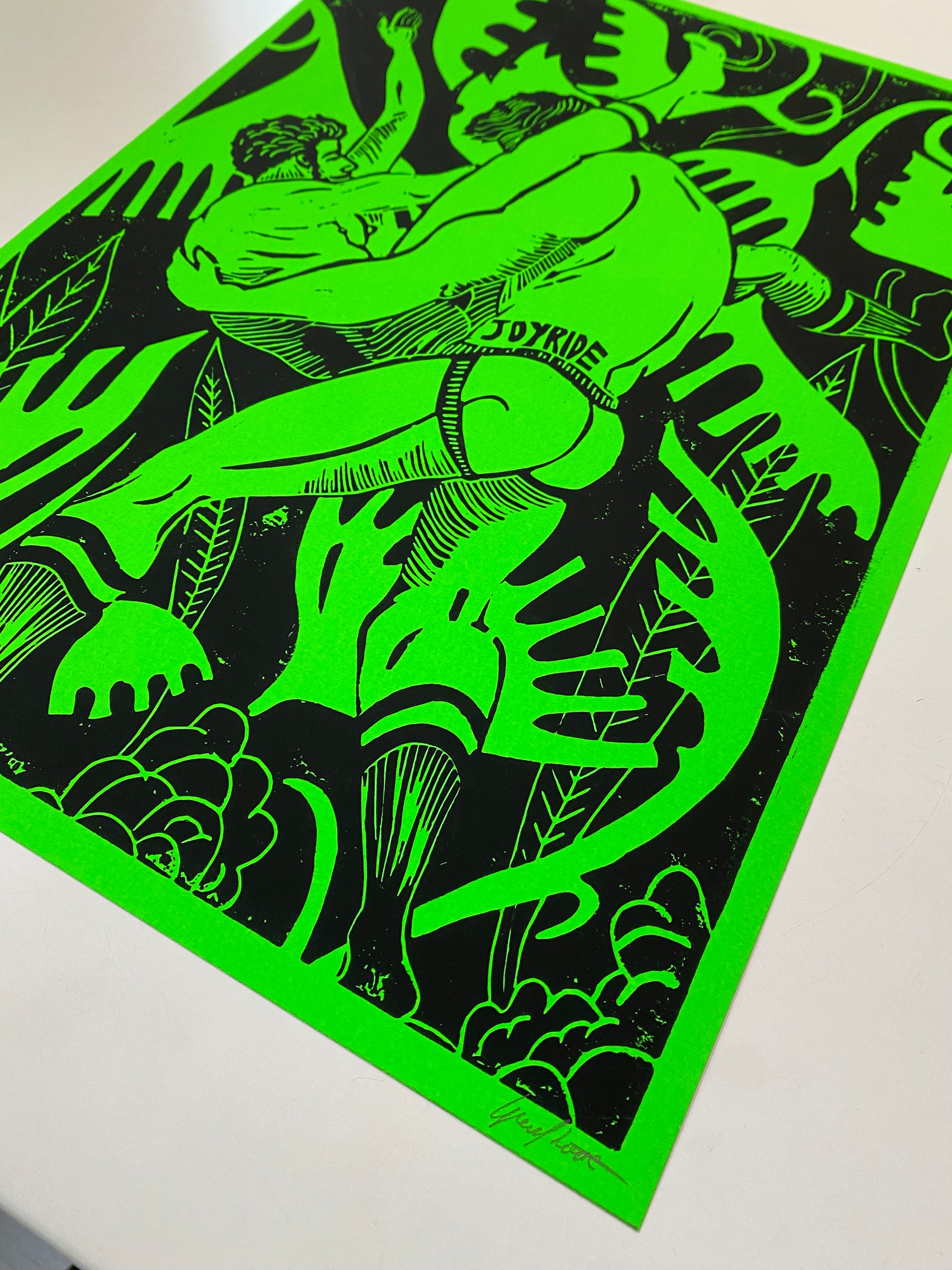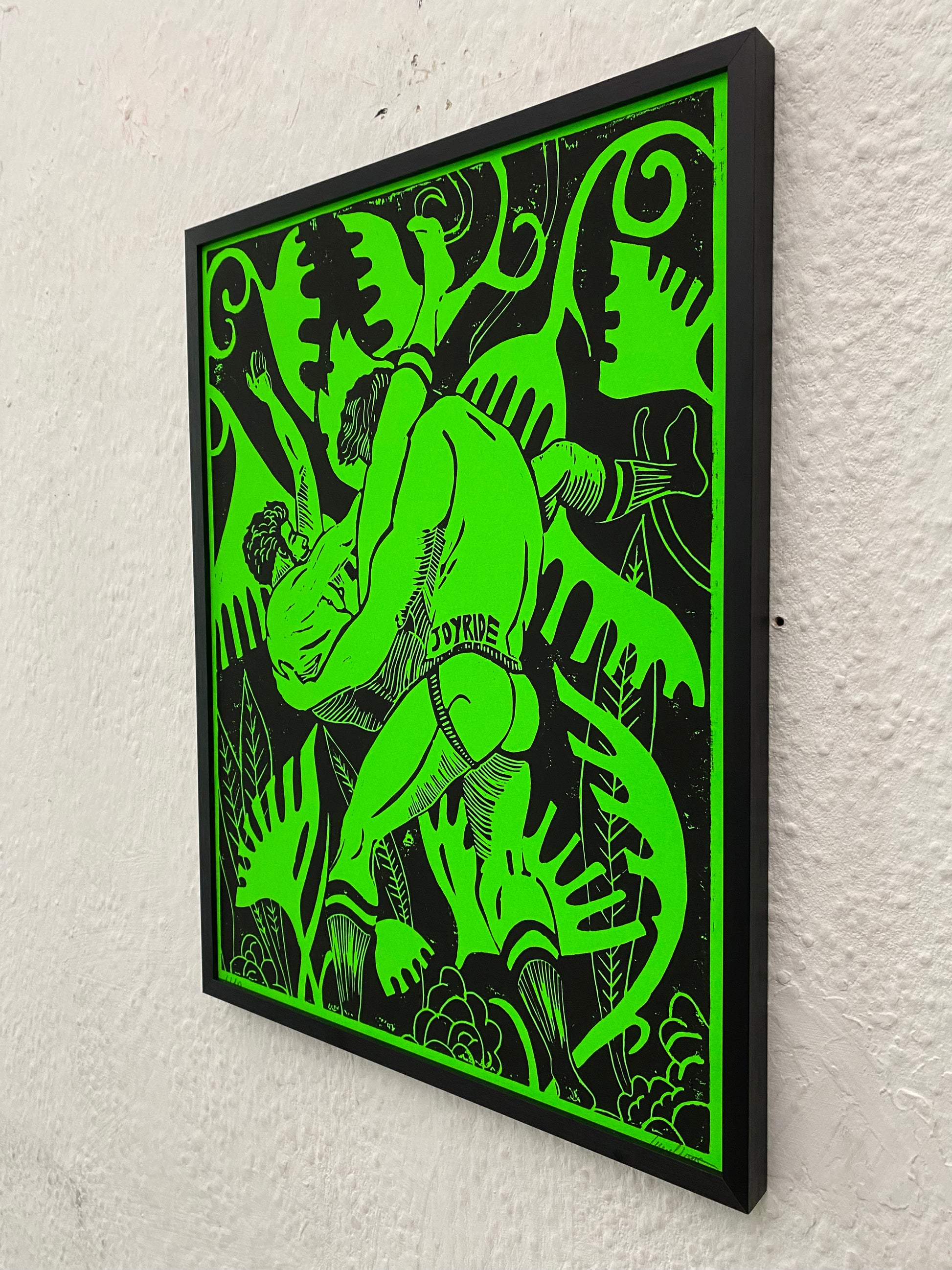JOYRIDE, Lino Cut Print, 40 x 30cm, Handmade print on 300g Fluorescent green paper with black ink, 2025.