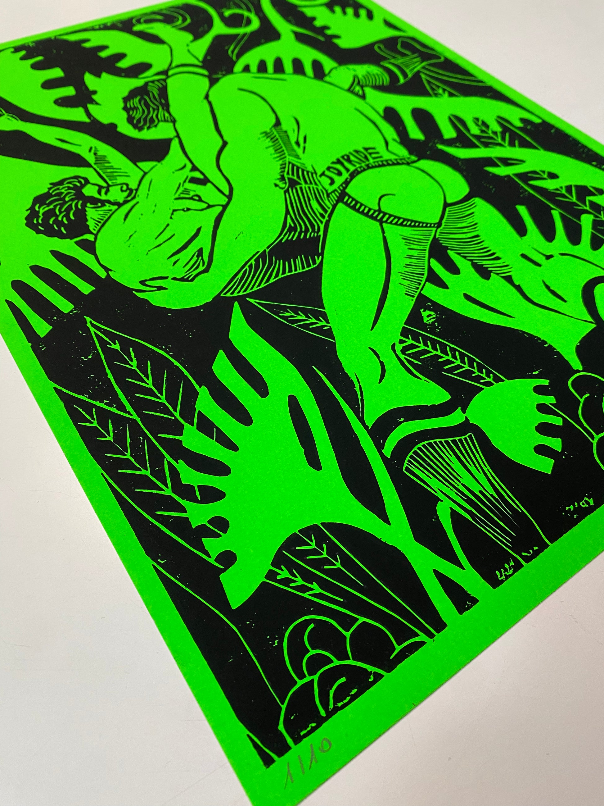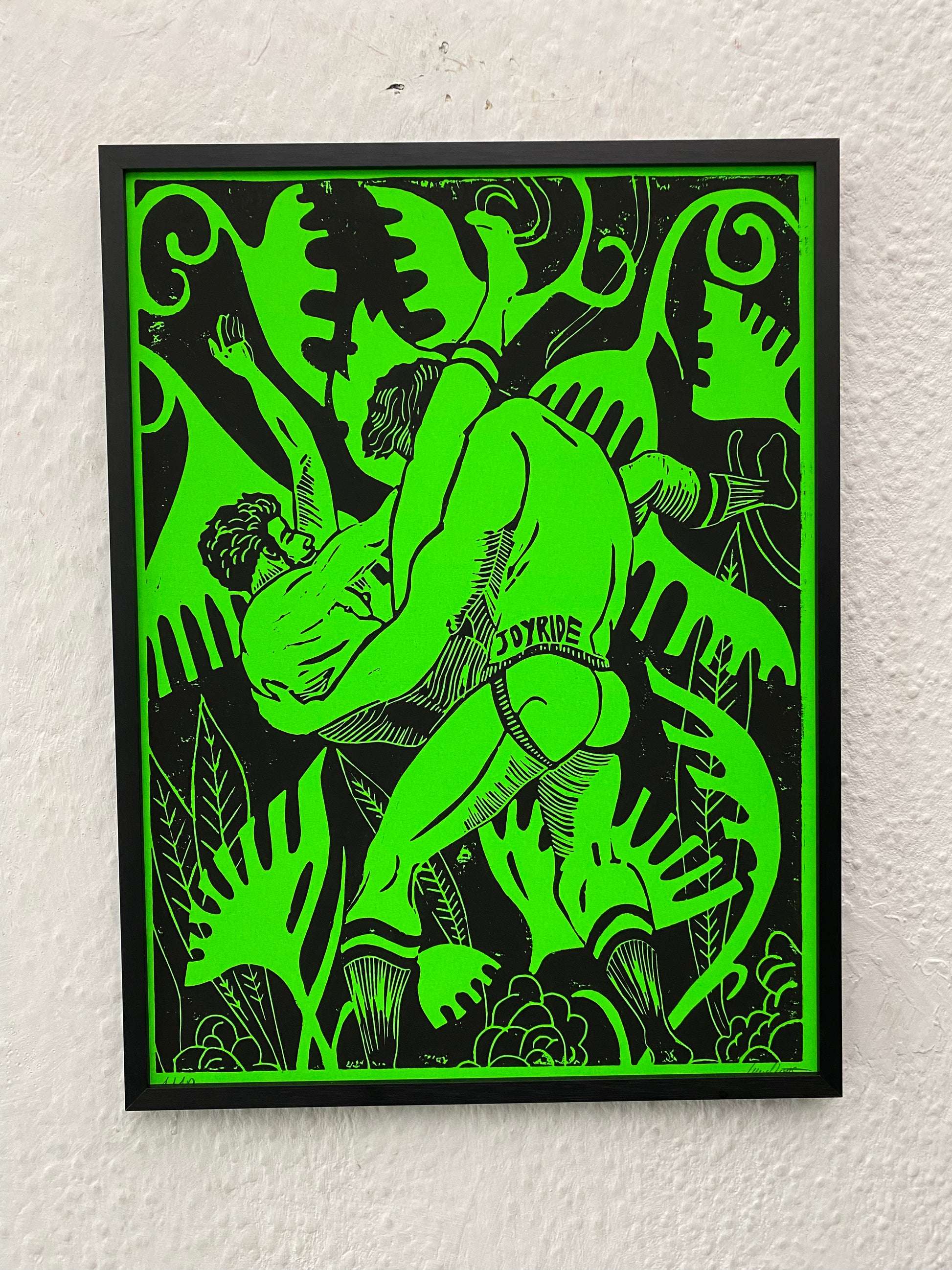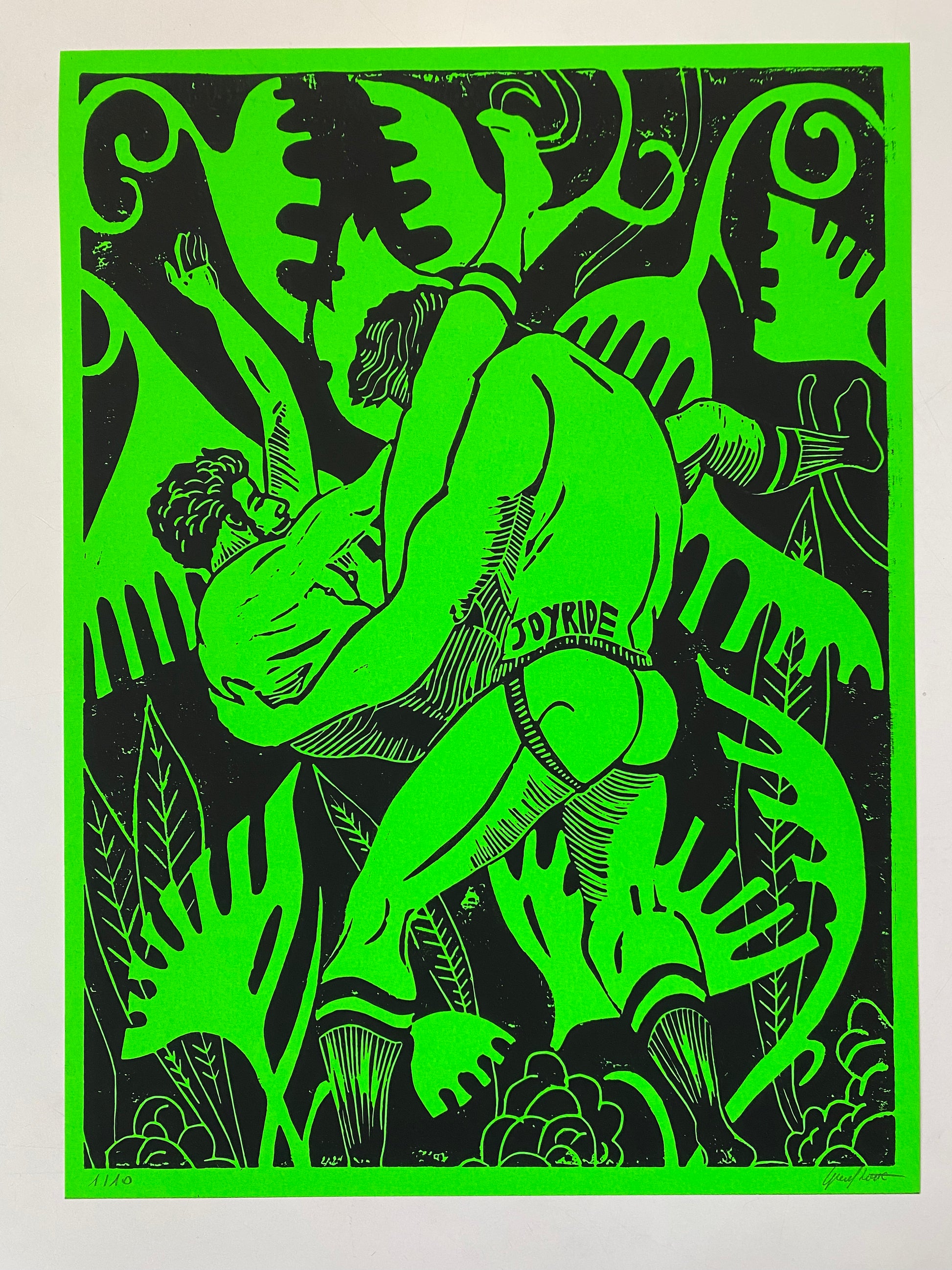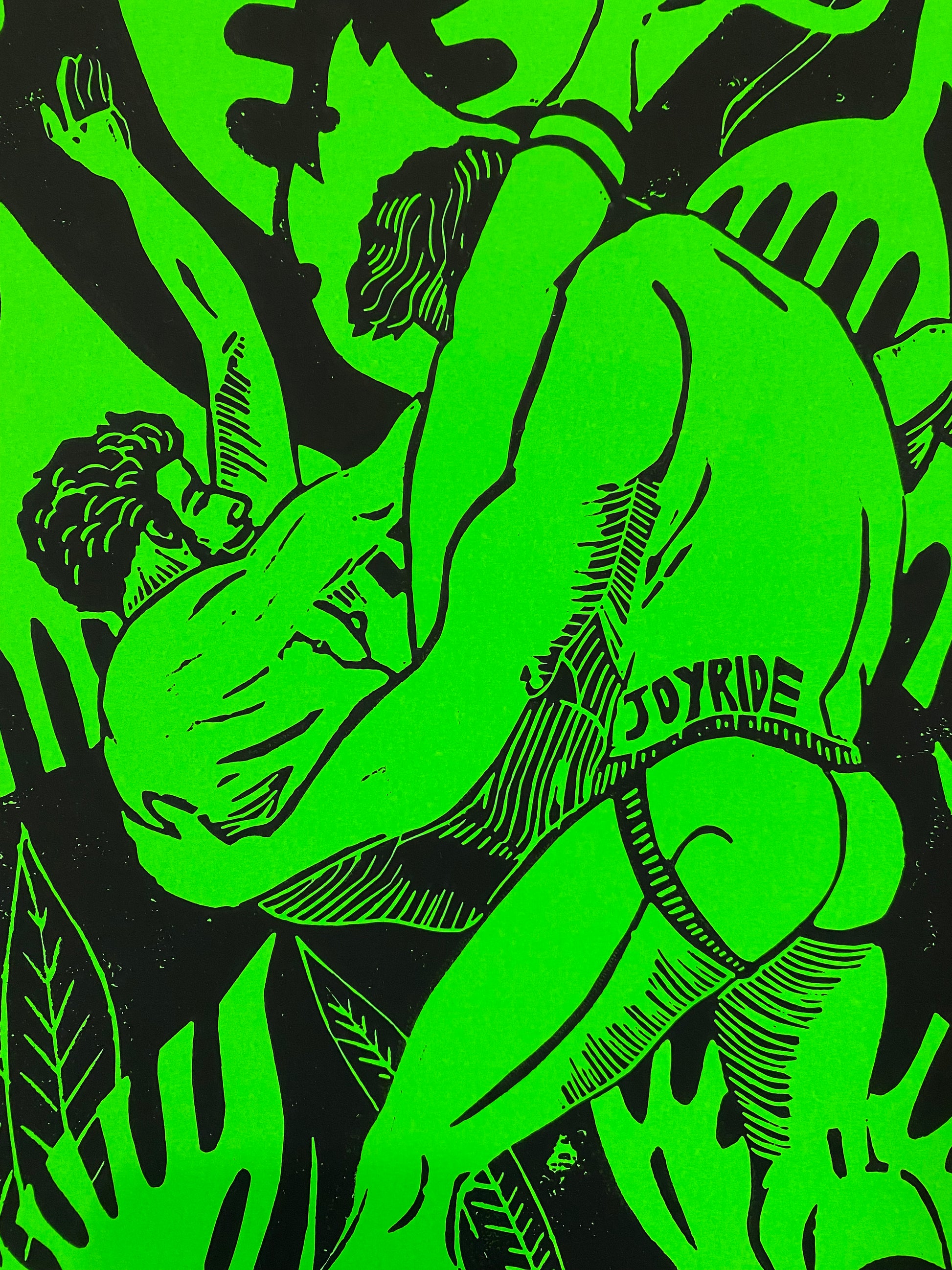 JOYRIDE, Lino Cut Print, 40 x 30cm, Handmade print on 300g Fluorescent green paper with black ink, 2025.